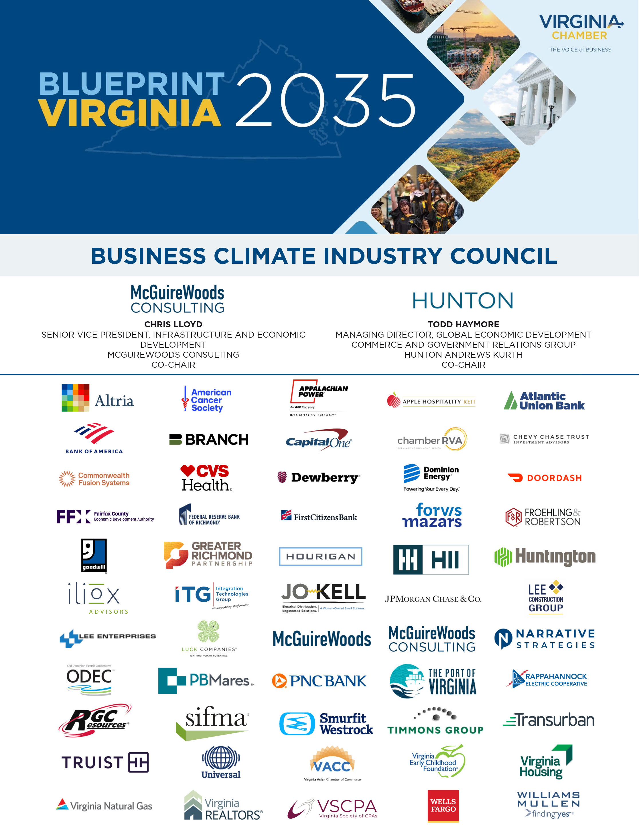 The Industry Council is working to implement the policies and initiatives outlined in the Business Climate chapter of the Virginia Chamber’s strategic plan, Blueprint Virginia 2035. The areas of focus identified within the document detail specific policy recommendations aimed at strengthening and further developing Virginia’s business community. Those areas of focus, broadly stated, include: