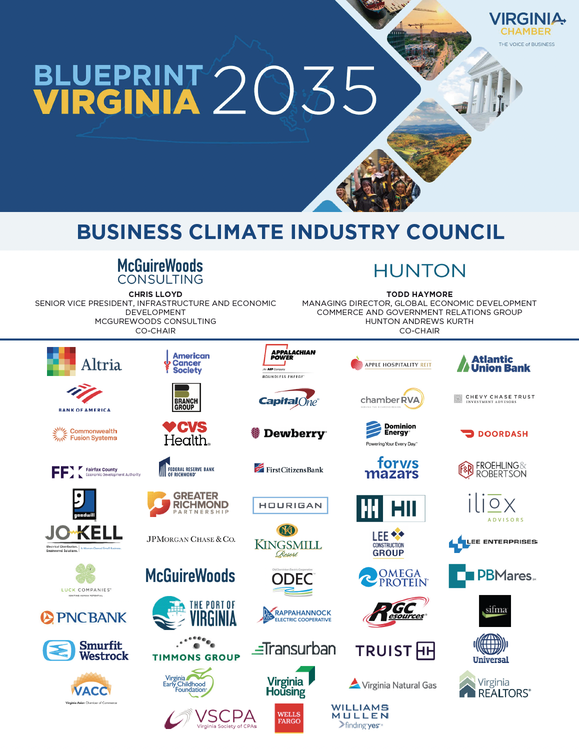 The Business Climate Industry Council provides thought leadership and advises policy research on initiatives that support the long-term economic development and growth of Virginia’s business community. Representing a strategic coalition of corporate member companies, the Industry Council is working collaboratively to preserve Virginia’s reputation as the #1 state for business.