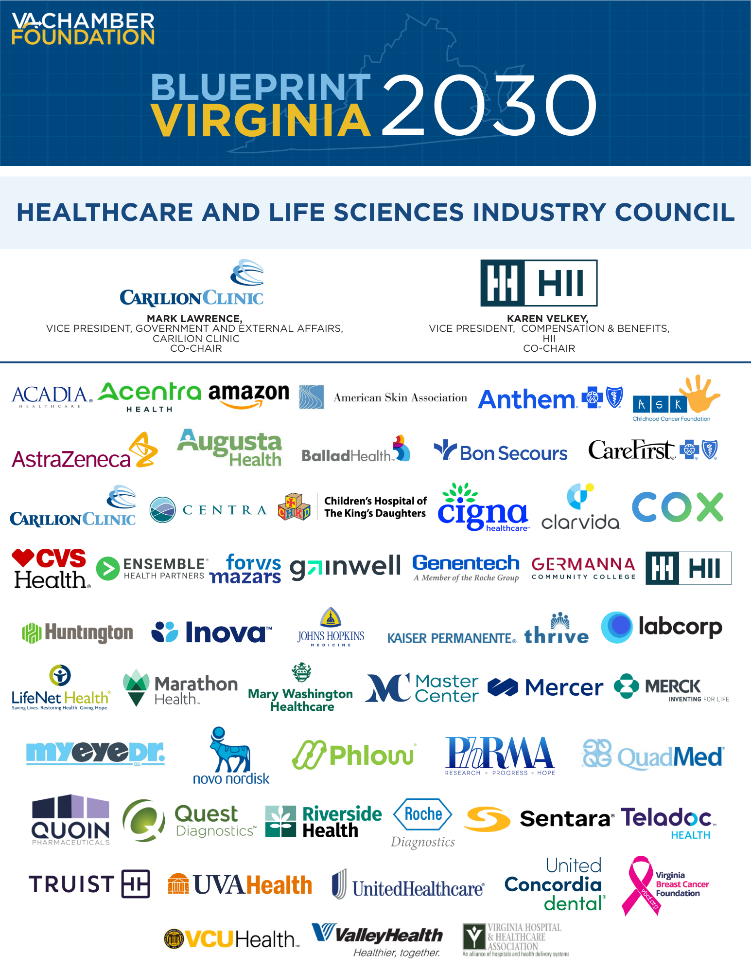 The Healthcare and Life Sciences Industry Council provides thought leadership and advises policy research to better understand the state’s unique healthcare challenges. Representing a diverse coalition of Virginia’s leading healthcare businesses, the Industry Council is working collaboratively to advance Virginia’s world-class healthcare system.