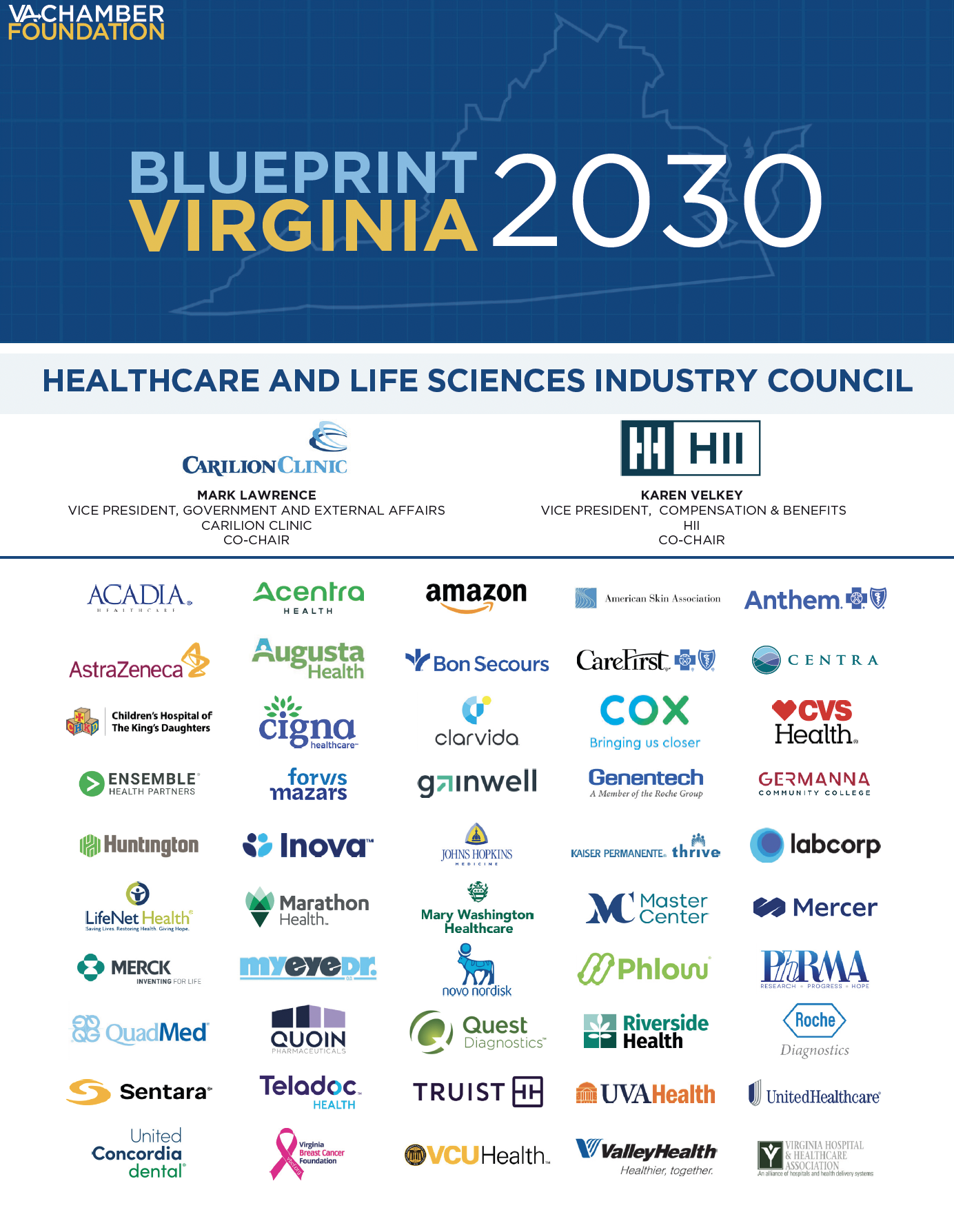 The Industry Council is working to implement the policies and initiatives outlined in the Healthcare chapter of the Virginia Chamber’s strategic plan, Blueprint Virginia 2030. The five areas of focus identified within the document detail specific policy recommendations aimed at strengthening the Virginia healthcare industry. Representing the objectives and goals of the Healthcare Industry Council, the five areas of focus broadly stated include: