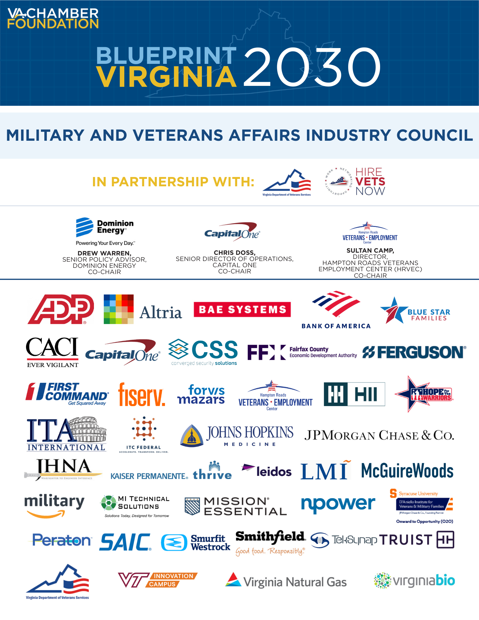 The Military and Veterans Affairs Industry Council led the Chamber’s development of Blueprint Virginia 2030 policy recommendations to ensure Virginia is the best state in the nation for our military families.  The Chamber developed Blueprint Virginia 2030 by bringing together leaders in business, military affairs, economic development, workforce, education, housing, and other community representatives to ensure statewide representation of priorities for Virginia’s economic prosperity.